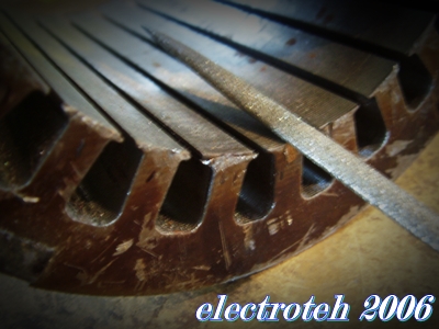 При дефектовке электротехнического железа особое внимание следует уделять краям пазов на предмет наличия острых заусенцев. Заусенцы опасны тем что при укладке всыпной обмотки могут повредить эмаль проводников, тем самым образовав место потенциального виткового замыкания. Заусенцы удаляются мелкими алмазными надфилями без негативных последствий для электростали.
